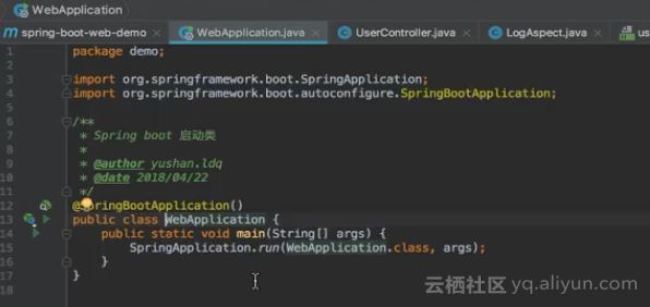 下图所展现的是WebApplication主程序类,在WebApplication中存在一个main函数,而main函数中只有一句代码就是SpringApplication.run(),然后将WebApplication类的信息作为参数传递进去。那么SpringApplication.run()的背后就是Spring的核心,即IOC容器的初始化以及其他工作。在IOC容器初始化完成之后,将收到WebApplication类的信息,同时因为@SpringBootApplication注解,IOC容器将开启对demo包以及其下面的子包中所有类的扫描,通过扫描IOC容器将发现很多需要用到的类并将这些类注入进去。