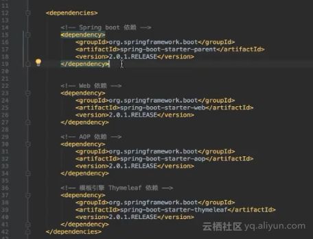 首先,示例工程使用Maven管理,这里首先定义了Spring Boot的依赖。Spring Boot是集成了Spring框架的开发套件,它将帮助开发者更快地开发Spring Web的应用。同时在依赖中还可以看到Web依赖、AOP依赖以及模板引擎Thymeleaf的依赖。