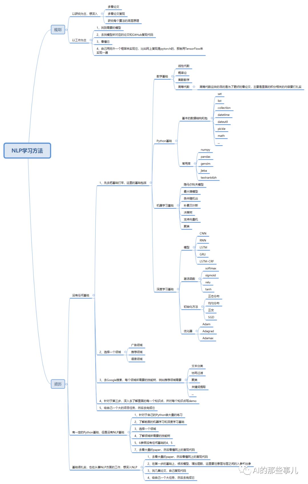 最近几个月,有很多同学都私信我,问我NLP到底应该怎么学,这两天我就根据自己的经验,做了一个简单的总结,导图在手机上看着可能比较小,大家可以在电脑上看,或者保存到手机再放大。如果第一次刷进来没有图,后退重进就好了,可能是因为图太大了。