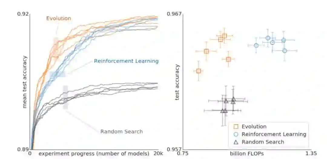 上图比较了进化算法,强化学习和随机搜索。在左侧,横轴是每种算法的实验次数,纵轴是实验中的平均精确度:结果显示,在起初实验次数较少时,进化学习的效果优于强化学习。这是一个重要发现,因为在计算能力较低时,实验可能不得不提前停止。此外,突变对数据集或搜索空间的变化非常稳健。总的来说,这种受控比较的目标是为研究界提供消耗大量计算能力的实验结果。在此过程中,我们希望通过提供不同搜索算法之间关系的案例研究来促进每个人在架构搜索上的研究。值得注意的是,上图显示,使用更少的浮点运算时,使用进化算法的最终模型可以达到非常高的精度。