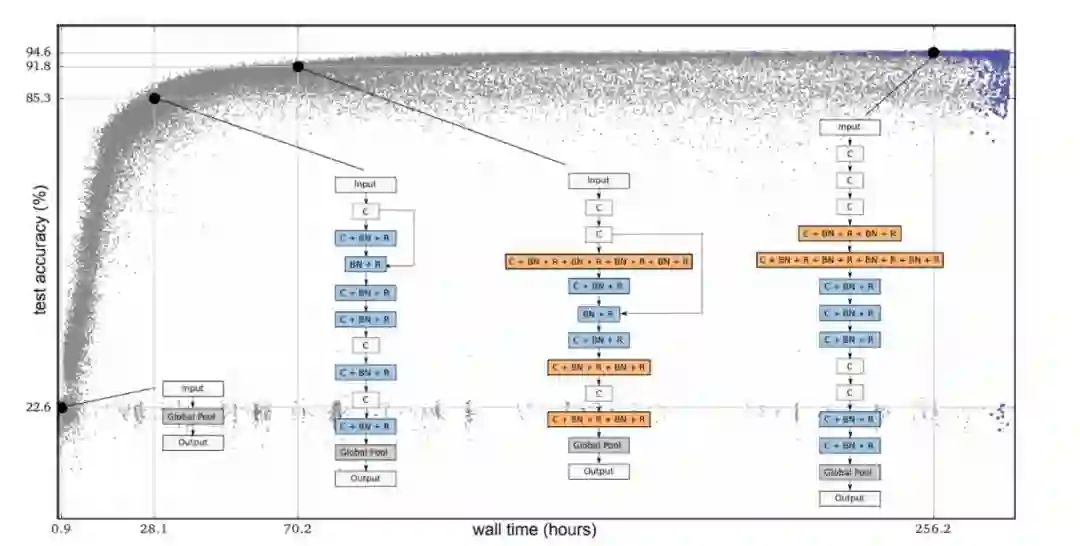 我们在第二篇论文中使用的进化算法的重要特征之一是正则化形式:不是删掉效果最差的神经网络,而是删除最老的一个——无论这个网络有多好。这提高了正在优化的任务变化的稳健性,并最终趋于产生更准确的网络。其中一个原因可能是因为我们不允许权重继承,所有的网络都必须从头开始训练。因此,这种正规化形式将选择在重新训练时仍然保持良好的网络。换句话说,因为训练过程中的噪声使得相同的架构也可能会得到不同的准确度值,所以一个模型显得准确可能只是偶然,只有在长期中仍保持准确的模型才能被保留下来。在这种思路下,我们选择重新训练良好的网络。更多有关细节可以在论文中找到。