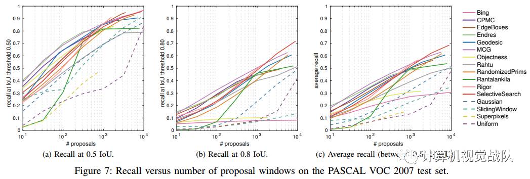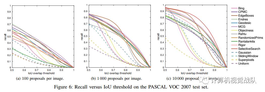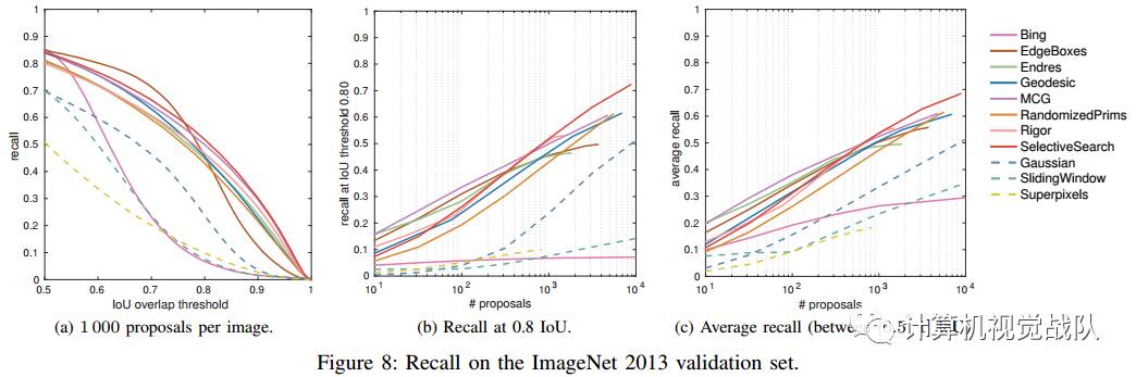 如果一开始没有较好的定位好候选框的位置,随着IoU标准严格,recall会下降比较快的包括了Bing, Rahtu, Objectness和Edgeboxes。其中Bing下降尤为明显;