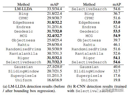 在LM-LLDA和R-CNN下,使得mAP最高的前5个OP方法都是MCG,SeletiveSearch,EdgeBoxes,Rigor和Geodesic,如下图。