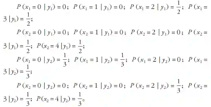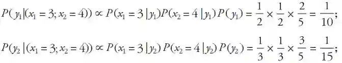 由于P (y1 | (x1 = 3;x2 = 4)) > P (y2 | (x1 = 3; x2 = 4)),故测试用例的类标是y1,即yes。