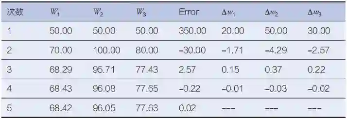 整个训练过程中各个参数变化如表4-4,为了便于阅读,将每次迭代W的变化罗列在表中,即表中的∆w1、∆w2、∆w3。