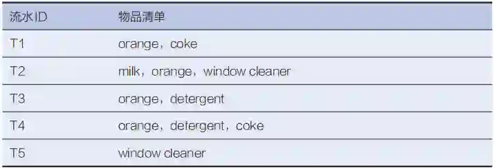 引用一个经典用例解释上述的若干概念,使用的数据集如表4-3所示,该数据集可以认为是超市的购物小票,第一列表示购物流水ID,第二列表示每个流水同时购买的物品。