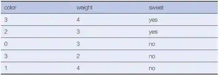 为了更好地理解上述计算流程,以一个具体的实例说明。已知一个训练集如表4-5所示,特征属性有两个,分别是color和weight,其中,color的取值范围是{0, 1, 2, 3};weight的取值范围是{0, 1, 2, 3, 4}。类标属性有1个(sweet),取值范围是{yes, no}。