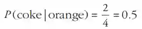计算示例1:计算“如果orange则coke的置信度”,即P(coke|orange),从上述的购物流水数据中可以发现,含有orange的交易有4个(分别是T1、T2、T3、T4),在这4个项目中仅有两条交易含有coke(T1、T4),因此