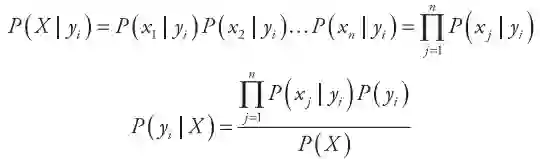 其中X表示特征属性(x1, x2, …, xn ),由于朴素贝叶斯是基于属性独立性的假设(前文已提及),故