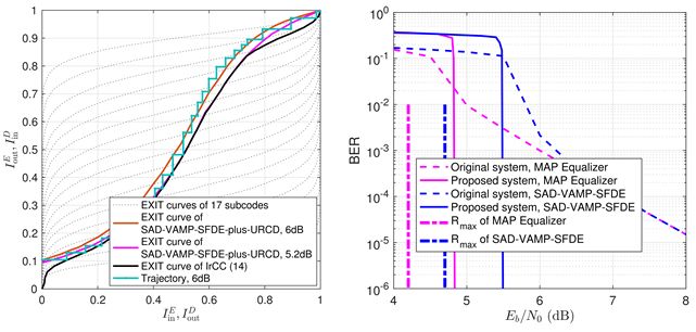 研究人员提出一种由半自适应阻尼(SAD, semi-adaptive damping)调节的向量近似消息传递频域软均衡器(VAMP-SFDE, vector approximate message passing-based soft frequency-domain equalizers),在低信噪比情况下,该均衡器可基于一定先验信息利用快速傅里叶变换以准线性复杂度完全消除符号间干扰。之后,研究人员基于均衡器的外部互信息转移(EXIT, extrinsic information transfer)曲线进行了内码与外码的设计与优化。内码引入单位速率码(URC, unity-rate code)形成有记忆映射以消除迭代译码的错误平层;外码设计为不规则卷积码(IrCC, irregular convolutional code),通过多分量码加权组合来匹配均衡器与内码级联的EXIT曲线,有效降低了迭代信噪比门限。最终,在接收端实现SAD-VAMP-SFDE、URC译码器、IrCC译码器的三阶turbo迭代处理。