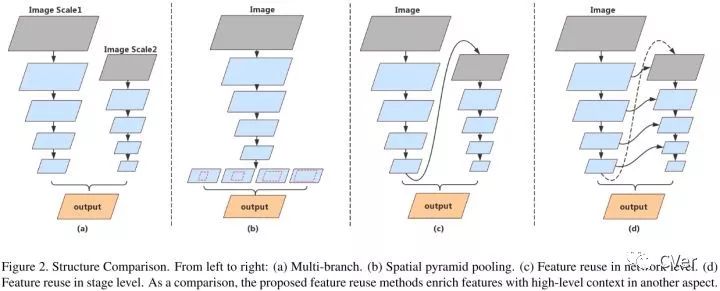 1.使用多个分支来进行多尺度的特征抽取并且保留图像的空间细节(图a)。但是这种方法缺乏对由并行分支结合而成的高级特征的处理,另外,并行分支的特征缺乏信息交流,还有,在高分辨率图像上额外添加分支对速度有影响。