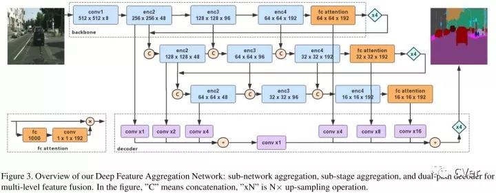 DFANet可以看成是一个encoder-decoder的结构。encoder是由3个Xception聚合的,包括子网络聚合和子阶段聚合。decoder简单的设计为特征上采样,然后融合低级和高级特征。所有backbone有相同的结构和相同预训练权重初始值。