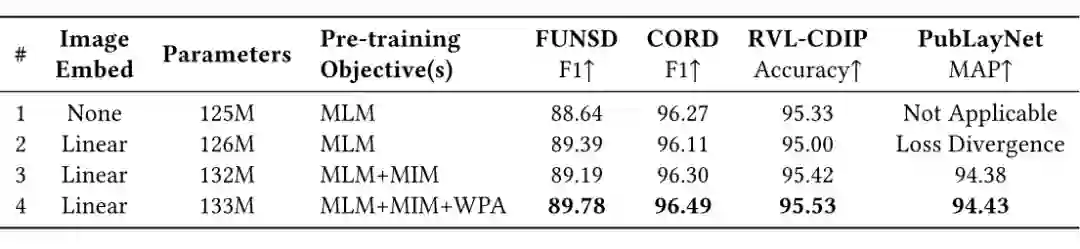 3. LayoutLMv3 使用消融实验来证明 MLM、MIM、WPA 几个任务的有效性。