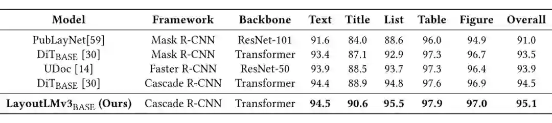 2. LayoutLMv3 在传统的视觉任务(PubLayNet)上进行 fine-tuning 的效果。