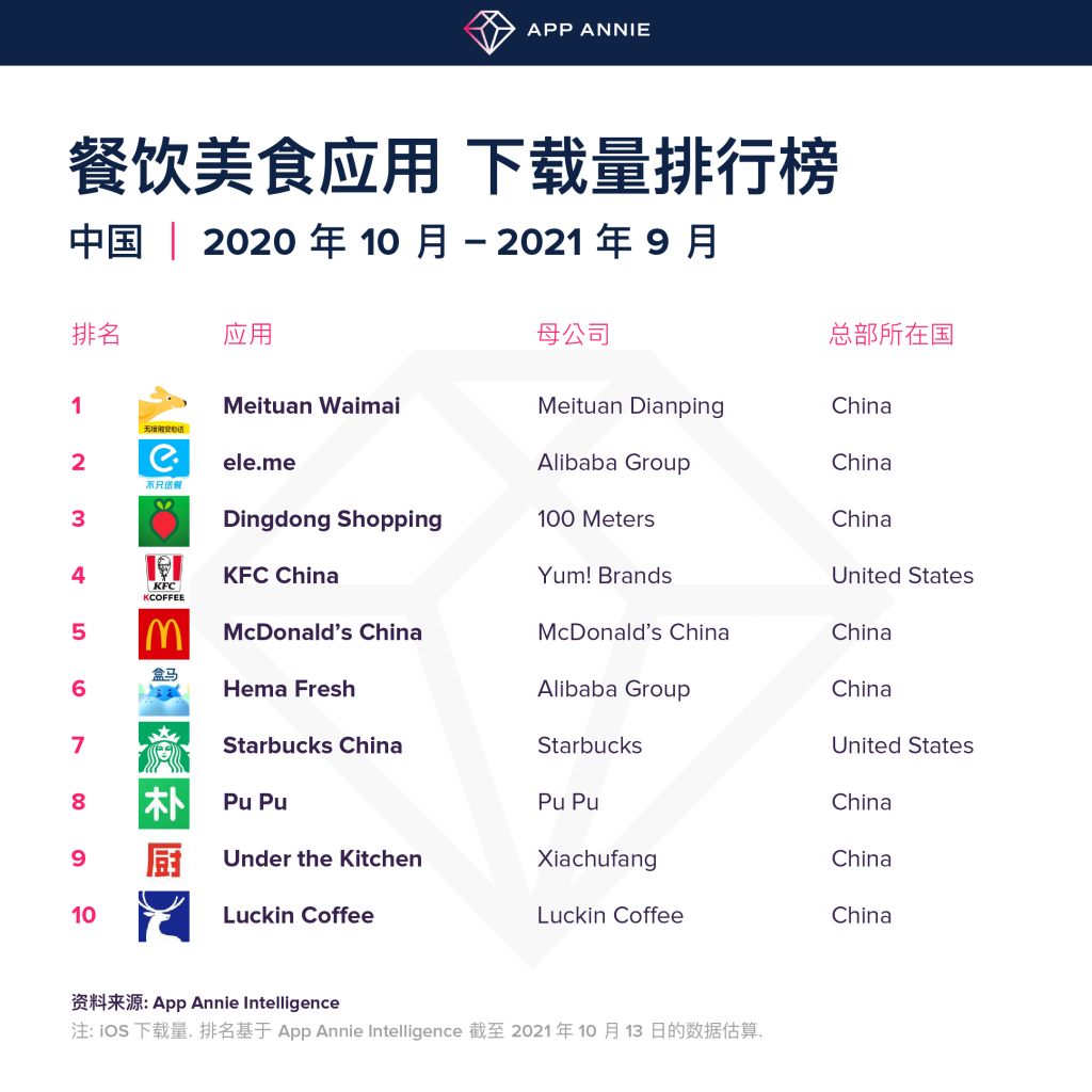 近日, App Annie 发布餐饮美食应用下载量排行榜分析报告,在 20 年 10 月至 21 年 9 月的 12 个月中,"美团外卖"应用全球下载量已超过 1 亿次,获得超 900 万次的评分,覆盖中国 250 多个城市的餐厅,毫无意外的成为餐饮美食类别中下载量排名第一的 iOS 应用,高居榜首。
