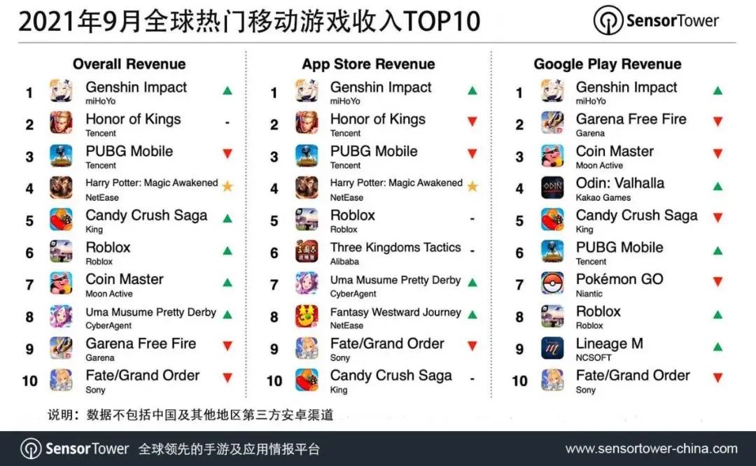 今日, Sensor Tower 公布了 2021 年 9 月全球热门移动游戏收入 TOP 10,米哈游戏《原神》移动端全球收入超过 3.41 亿美元,位列全球手游收入榜榜首,其中中国是该游戏收入最高的市场,中国 iOS 收入占 31.6%,美国市场占 21.7%;腾讯《王者荣耀》以 2.09 亿美元的收入位列榜单第 2 名,中国 iOS收入占 95%,海外收入占 5%。榜单前五另外三款游戏为腾讯《PUBG Mobile》、网易《哈利波特:魔法觉醒》和 King《Candy Crush Saga》。