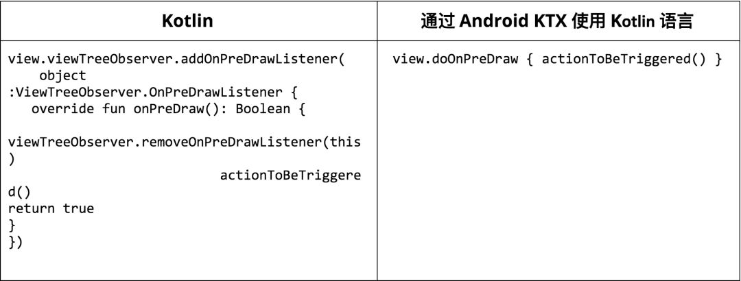 下例演示了在视图 (View) 中的 onPreDraw 回调函数执行其他任务 (Action)。若不使用 Android KTX,开发者须编写更多代码。