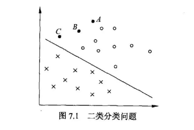 上图中,X表示负例,O表示正例。此时的训练数据可分,线性可分支持向量机对应着将两类数据正确划分并且间隔最大的直线。