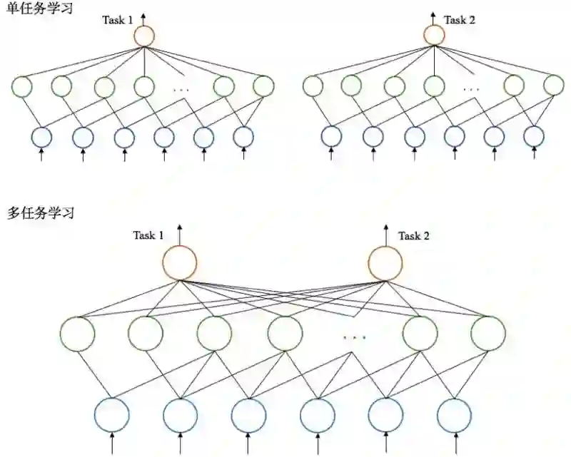 通过 NN 实现多任务学习的思路比较直观,如下图所示。图片上方是使用 NN,做单任务学习的示意图,不同任务间并无任何关联,即“一心一意”。图片下方是使用 NN,进行多任务学习的模型示意图,可以看到两个任务共享一些神经网络层及其相关联的模型参数,但输出层对应两个不同的任务,以此来实现多任务学习。