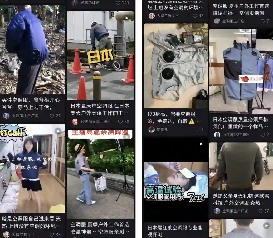 但也有乐观的变化在发生。新能源产业在国内如火如荼,随着未来电池技术的提升,有望为充电宝、空调服等产品带来升级。同时我们观察到,如今工友们也乐于在短视频等内容平台上,展现其生活。我们报道过的夏季防晒面罩,冬季滑雪防摔垫,都实现了新兴社交媒体“种草”——电商平台“拔草”的路径,空调服也完全有可能通过这一模式,提升声量和销量。