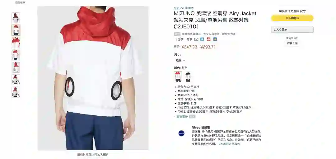 “风神”是日本空调服市场的成熟品牌,亚马逊上,其产品定价在400—800元之间。较之国内,日本空调服市场在标准化、品牌化上都更为领先。甚至,日本运动品牌美津浓,也针对性地推出了预留风扇孔的空调服夹克衫,起售价约240元人民币。