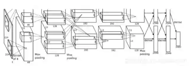 这个CNN架构模型清晰地展示了两个GPU之间的责任划定:一个GPU运行图形顶部的图层部分,另一个运行图层底部的图层部分。