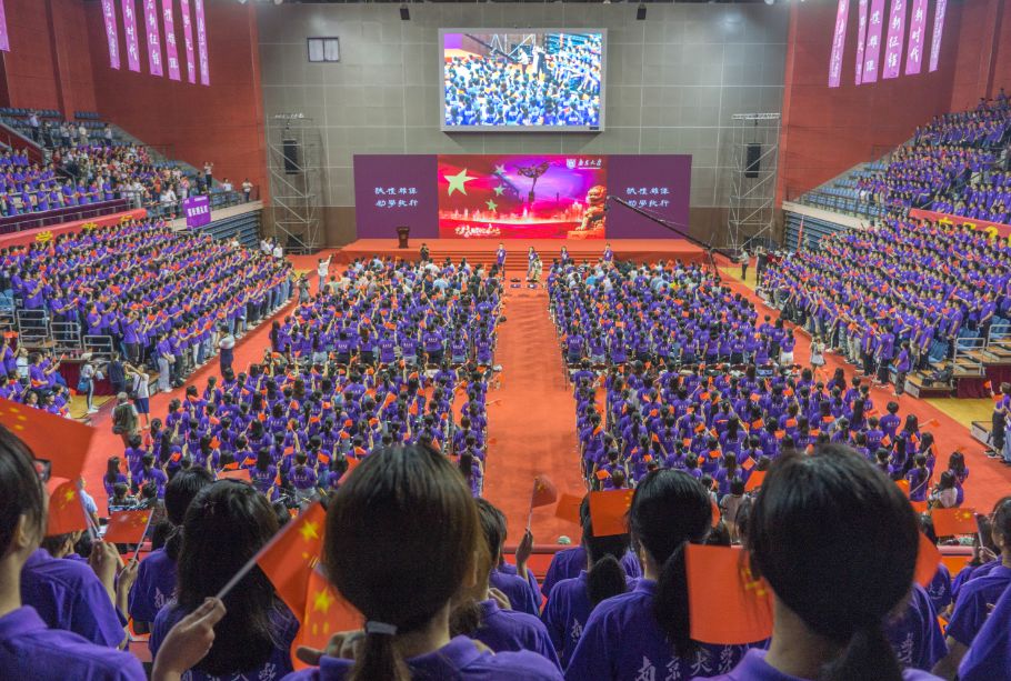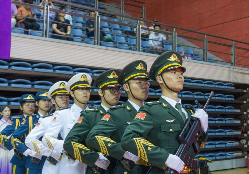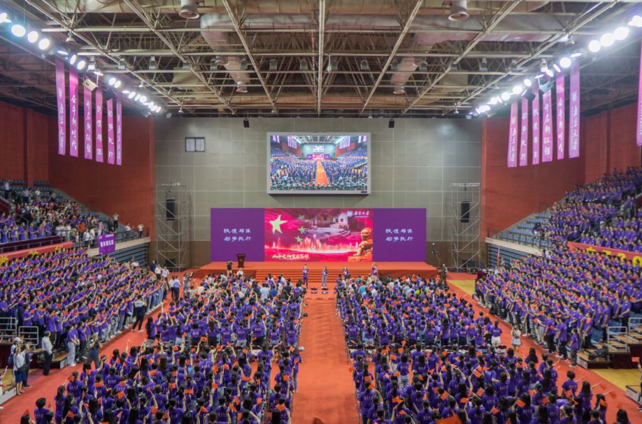 国旗护卫队踩着庄严的步伐将国旗迎到台上,让大家瞬间肃然起敬、热血沸腾,全体新生齐声高唱国歌,整齐而又响亮的国歌声响彻方肇周体育馆,小蓝鲸们在南大的精彩生活正悄悄拉开帷幕!