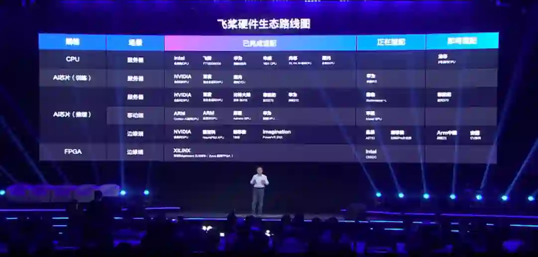 此外,飞桨的生态建设离不开广大的生态伙伴。为了加快生态建设,飞桨在 5 月份发布了硬件生态圈共建计划。在半年之后的今天,马艳军宣布: