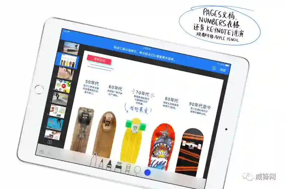 更新后,用户可以尽情地使用 Apple Pencil 在 Pages、Keynote 和 Numbers 上面添加图形、手写注释或者记录笔记,并将这些内容完整地插入到文档中,就想目前大多数支持 Apple Pencil 的手写笔记软件那样,学生/教师用户们的使用场景将更加开放。