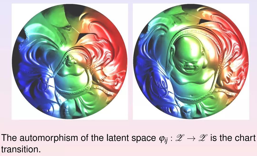 回答:这是对的。数据分布肯定不是正态分布。我们核心是说通过变换把数据分布映到隐空间,然后使得数据分布在隐空间是正态分布。这话怎么理解,我们可以再看刚才弥勒佛的例子(图1)。我们把弥勒佛的曲面映到平面上来,相当于你做了编码映射。编码映射之后实现了降维。然后,弥勒佛上面的面元可以看成是概率分布。那这个面元在平面分布这两个图像上是完全不同的,在右侧它是均匀分布,在左侧它不是均匀分布。核心是我们通过调节在平面的映像使得弥勒佛本身的面元在平面上变得均匀分布,那么这是我们所作的目的。