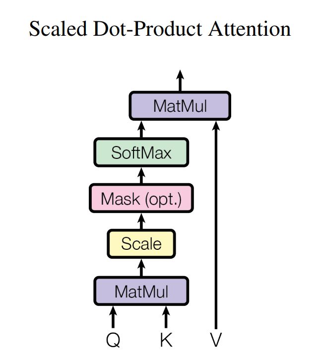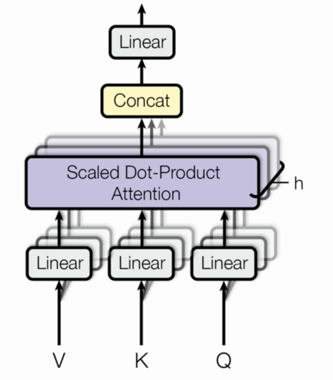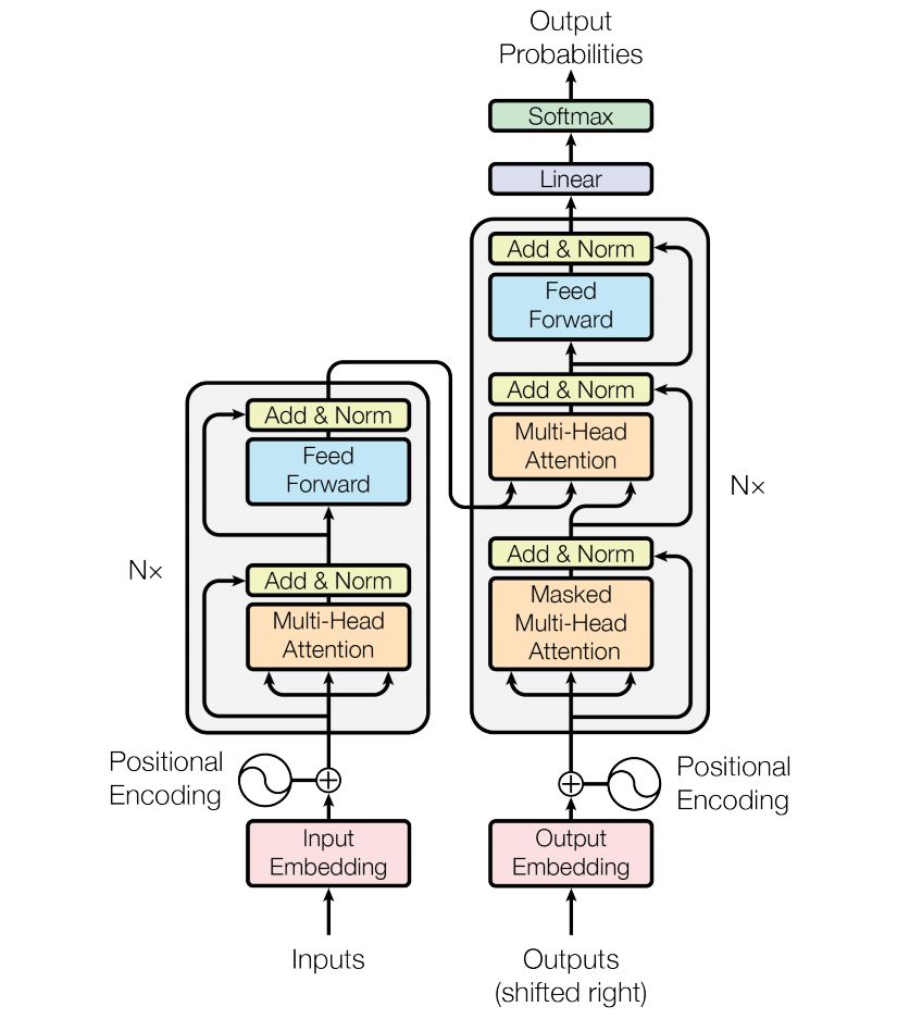 如上所示,左侧为输入序列的编码器。输入序列首先会转换为词嵌入向量,在与位置编码向量相加后可作为 Multi-Head Attention 模块的输入,该模块的输出在与输入相加后将投入层级归一化函数,得出的输出在馈送到全连接层后可得出编码器模块的输出。这样相同的 6 个编码器模块(N=6)可构成整个编码器架构。解码器模块首先同样构建了一个自注意力模块,然后再结合编码器的输出实现 Multi-Head Attention,最后投入全连接网络并输出预测词概率。