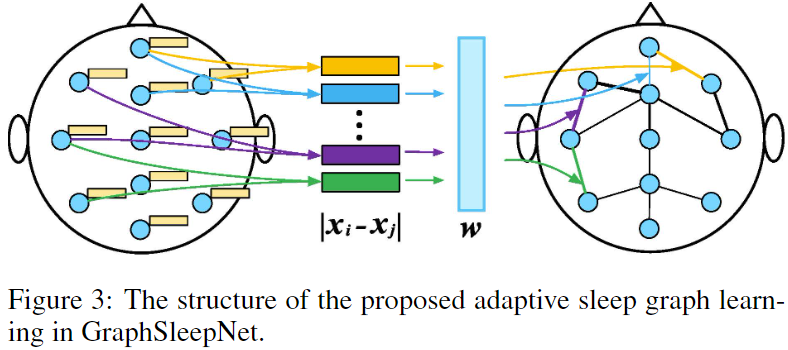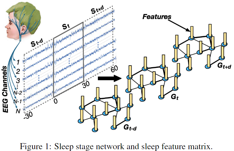 基于图卷积神经网络在图结构数据中的成功应用,我们采用图结构表示方法研究睡眠分期问题,在多导 EEG 数据中,每个 EEG 通道对应于睡眠图中的一个节点,两个节点之间的连接对应于睡眠图中存在的边。