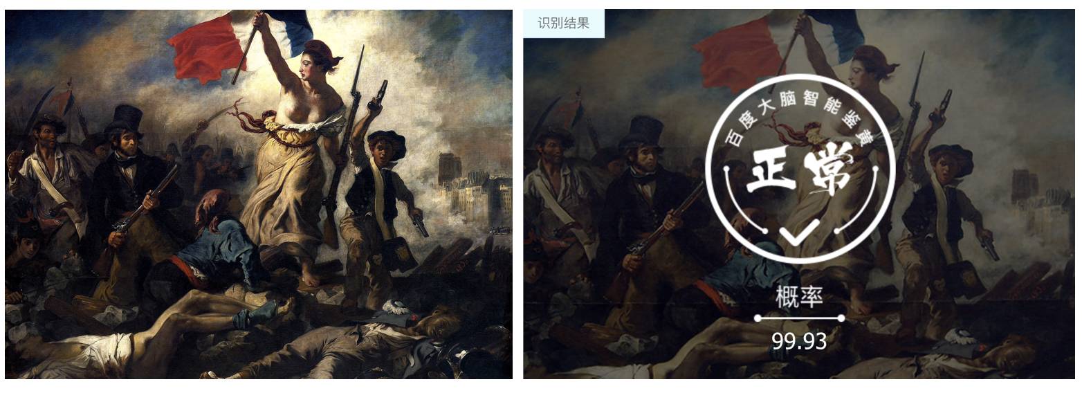 例如,百度的色情识别功能就能把图片分为色情、性感和正常三个类别,并能准确将含有袒露上半身的自由女神的名画《自由引导人民》识别为「正常」。