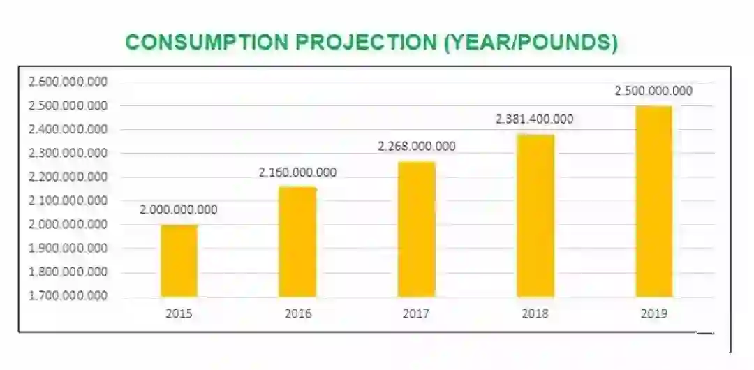 营销组合拳的结果是,2014年美国全年消耗牛油果约12亿磅,2015年飙升至20亿磅,涨幅高达40%,随后的几年也都保持了高增速。2017年超级碗当夜,美国人就吃掉了1.2亿磅牛油果。