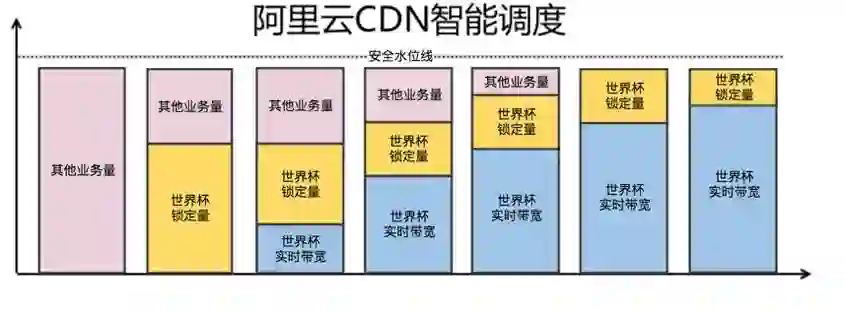 针对流量带宽以每分钟上T带宽的速度剧烈攀升、下降以及几千级同时观看的巨大流量,阿里云采用了CDN智能调度技术,可根据大型活动实时带宽智能预测资源水位,将闲置资源优先分配给重点保障业务。