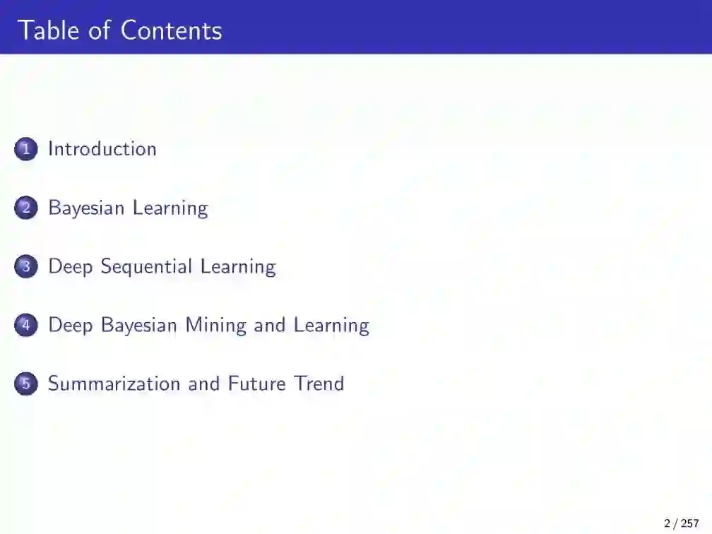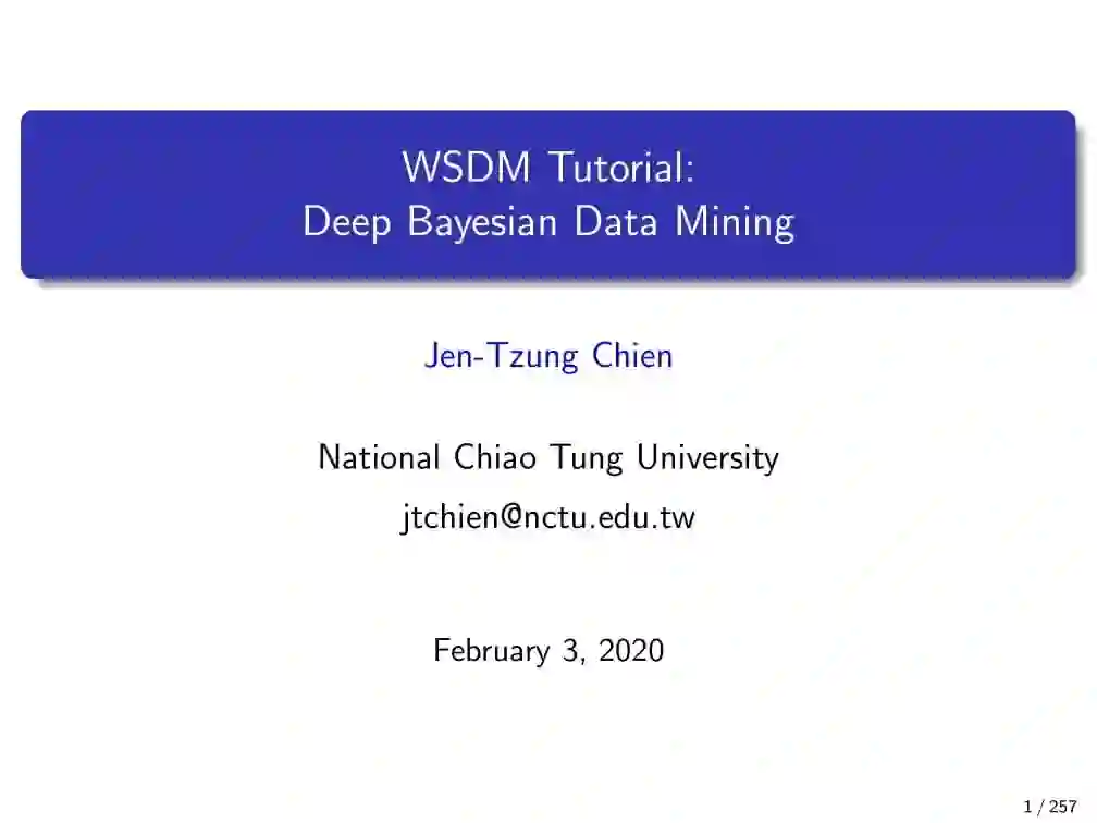 【导读】台湾交通大学的Jen-Tzung Chien教授在WSDN 2020会议上通过教程《Deep Bayesian Data Mining》介绍了深度贝叶斯数据挖掘的相关知识,涵盖了贝叶斯学习、深度序列学习、深度贝叶斯挖掘和学习等内容。