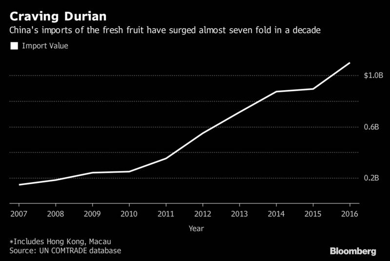 根据联合国的数据,过去10年,中国进口的鲜榴莲货值年均增长26%,2016年达到11亿美元。在这个市场,泰国向来占据主导地位,但马来西亚的政治家希望借助“榴莲外交”扩大其市场份额,而不仅仅限于出口冰冻的果肉。11月早些时候在中国南宁市举行的马来西亚榴莲节,吸引了大约16.5万人排队品尝该国顶级榴莲品种猫山王(Musang King)的解冻全果样品。