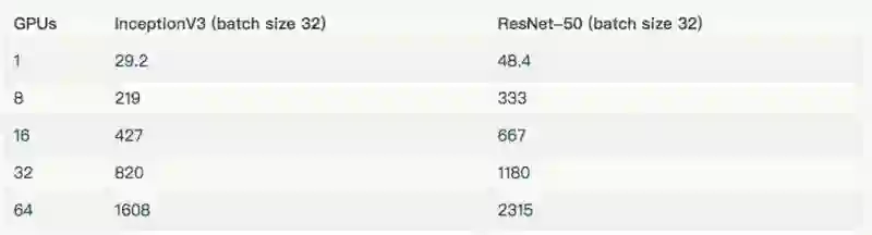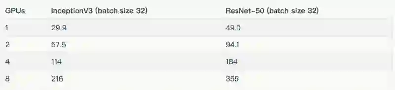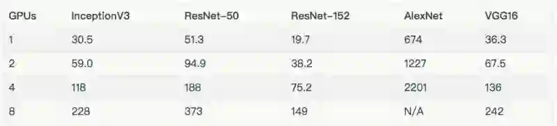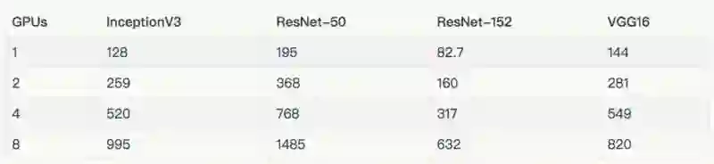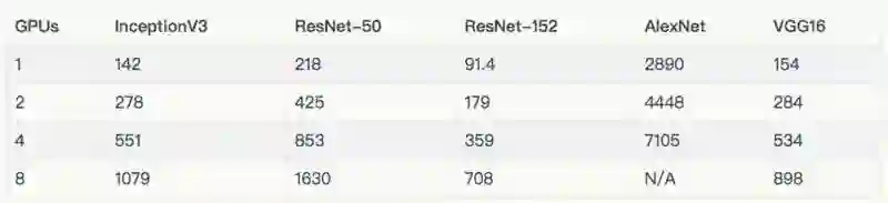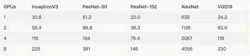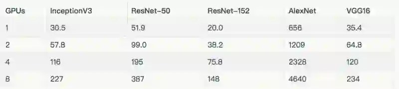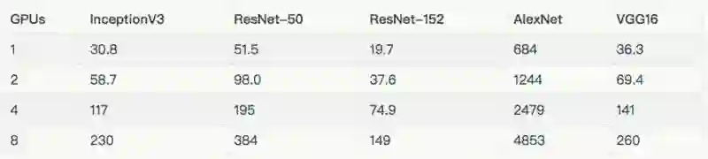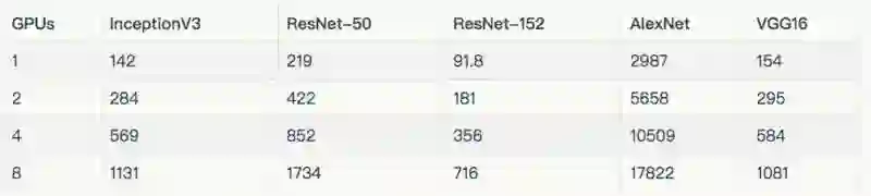 在上述图标和表格中,排除了在 8 个 GPU 上使用真实数据训练的 AlexNet,因为它将输入管线最大化了。