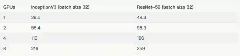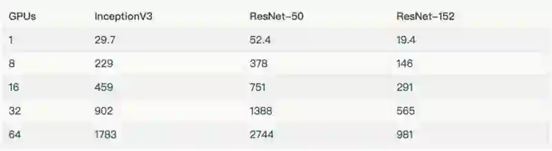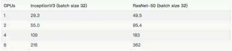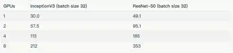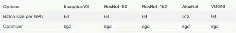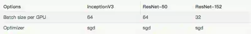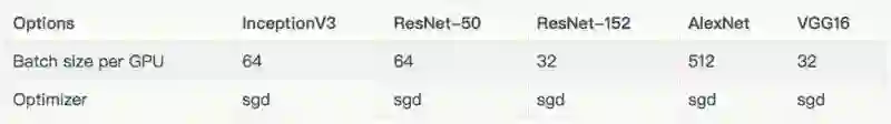 下标列出了每种模型所使用的批量大小和优化器。除去表中所列的批量大小外,InceptionV3 和 ResNet-50 的批量大小为 32。这些结果都在“其他结果”一节中。