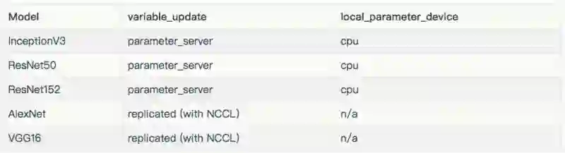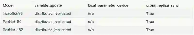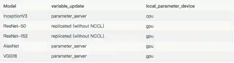 用于每个模型的配置的variable_update、 parameter_server、local_parameter_device 和 cpu,它们是相等的。