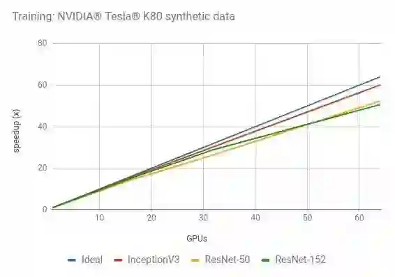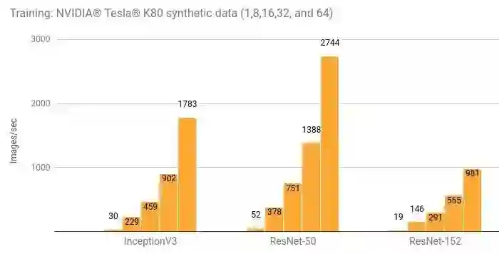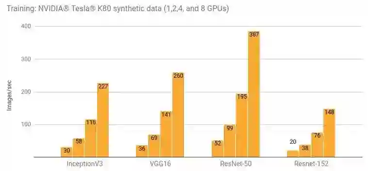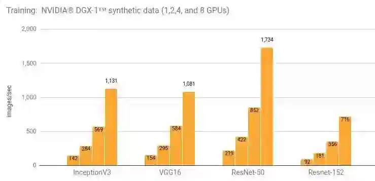 InceptionV3[2]、ResNet-50[3]、ResNet-152[4]、VGG16[5] 和 AlexNet[6] 使用 ImageNet[7] 数据集进行测试。测试环境为 Google Compute Engine、Elastic Compute Cloud (Amazon EC2) 和 NVIDIA® DGX-1™。大部分测试使用了合成数据和真实数据。使用合成数据进行测试是通过一个 tf.Variable 完成的,它被设置为与 ImageNet 的每个模型预期的数据相同的形状。我们认为,在基准测试平台中,包含真实数据的测量非常重要。这个负载测试底层硬件和框架,用来准备实际训练的数据。我们从合成数据开始,将磁盘 I/O 作为一个变量移除,并设置一个基线。然后,用真实数据来验证 TensorFlow 输入管道和底层磁盘 I/O 是否饱和的计算单元。