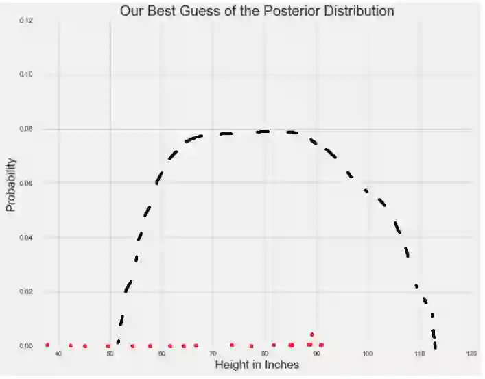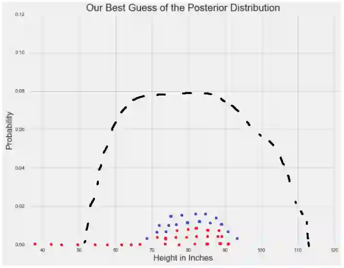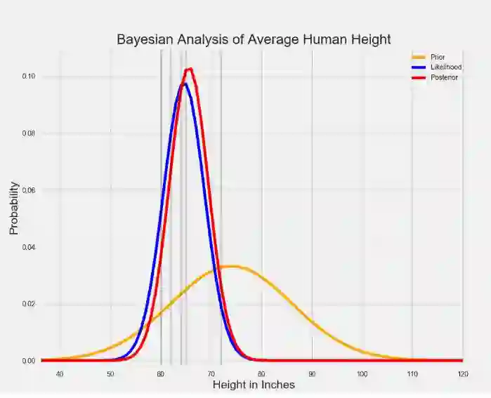 当先验和可能性结合在一起时,数据(可能性分布表示)弱化了个体在巨人中长大的可能性。 尽管那个人仍然认为人的平均身高比数据告诉他的稍高一些,但是他最相信的还是数据。