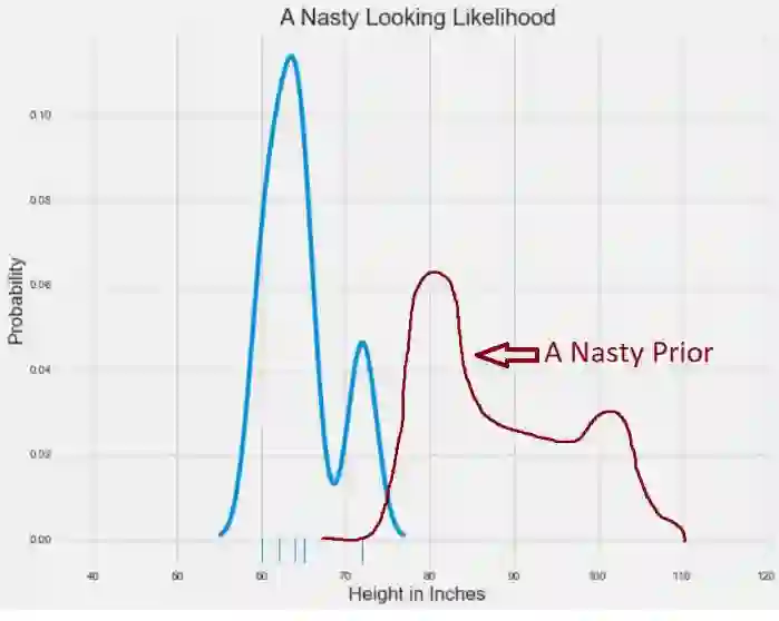 在两条钟形曲线的情况下,求解后验分布是非常容易的。 有一个简单的方程来结合这两者。 但是如果我们的先验分布和可能性分布不那么好呢?
