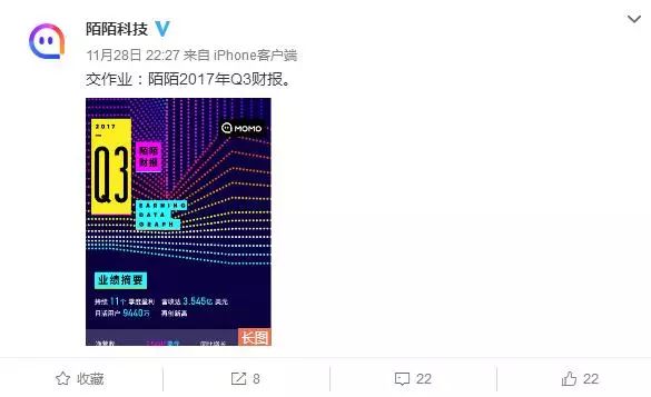 11月28日晚间,陌陌科技官方微博发了这样一条微博,向众人交出自己Q3的完美答卷。