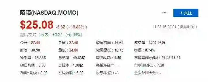 当日陌陌在盘前就一度大跌20%,低迷的股价在交易时间丝毫没有反弹的迹象,最终陌陌收盘股价下跌5.82美元至25.08美元,跌幅达18.84%,创下三个月最大跌幅。