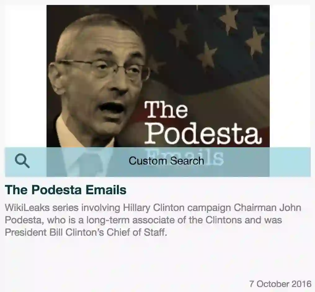 2016年10月,曝光希拉里·克林顿竞选团队经理Podesta邮件,指责希拉里曾“支援”ISIS。