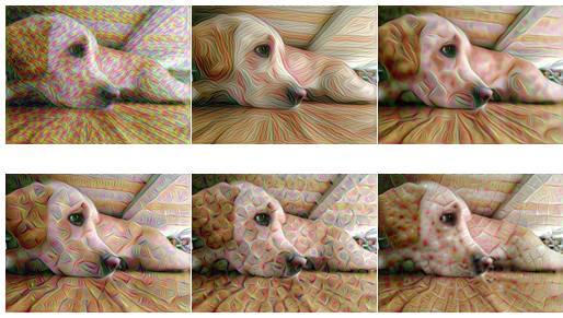 给模型网络中加一个反馈回路,让每一层网络可以朝着使最后分数变大的方向上修改狗狗照片。每次迭代网络中的每层都会在狗照上增加一些毕加索猫的特征痕迹,可以迭代很多次,让狗狗照片中加入越来越多的毕加索猫的实物特征。