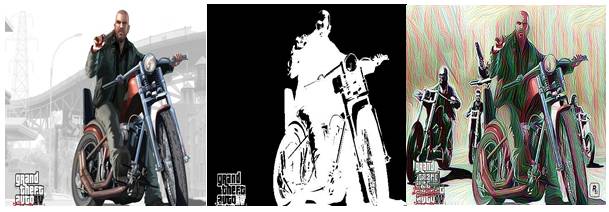 使用两个GTA5的图片,融合摩托车大哥到大部队中,作为图9-23所示的原始图片的引导特征图: