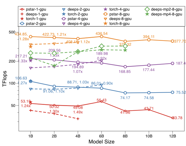 上图展示了DeepSpeed stage3,PyTorch系统在 1、2、4、8 个 GPU 上的性能。y 轴通过对数方式重新缩放。这些点代表在一个 GPU 上使用 4、8、16、32 和 64 批大小测试的最佳结果。圆点周围的值表示 派大星 在 Tflops 中的吞吐量及其对 DeepSpeed 的加速。deeps 是 DeepSpeed-DP,deeps-mpX 是 DeepSpeed使用X路的模型并行结果。模型的计量单位是B表示十亿Billon。