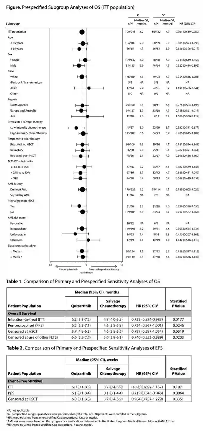 367例患者纳入了随机分组,其中245例和122例分别入组奎扎替尼和挽救化疗组 (LoDAC, n=29; MEC, n=40; FLAG-IDA, n=53)。随机分配的两组中分别有4例和28例患者未接受治疗。中位随访期为23.5月。奎扎替尼和挽救化疗组的OS风险比(HR)为0.76,中位OS分别为6.2月与4.7月。奎扎替尼和挽救化疗组EFS的HR为0.90,中位EFS分别为6周和3.7周。OS和EFS的敏感性分析均证实了奎扎替尼较之于挽救化疗的获益,OS的亚组分析结果与之类似,包括等位基因比率、是否先行HSCT、AML风险评分以及对先前治疗的反应 (Tables 1和2, Figure)。奎扎替尼和挽救化疗组的CRc分别为48%和27% (P=0.0001);CRc维持期分别为12.1周和5周。移植率分别为32%和12%(P<0.0001),而在79例符合条件的患者中,49例(62%)在移植后恢复了单药奎扎替尼治疗,中位治疗期为129天。两组治疗中出现的不良反应率类似,最常见的3级及以上不良反应是感染和血细胞减少相关不良反应。仅2例患者因QT间期延长终止奎扎替尼治疗,在奎扎替尼治疗组中QT间期>500ms(3级)发生率为3%,未检测到4级QT间期延长。